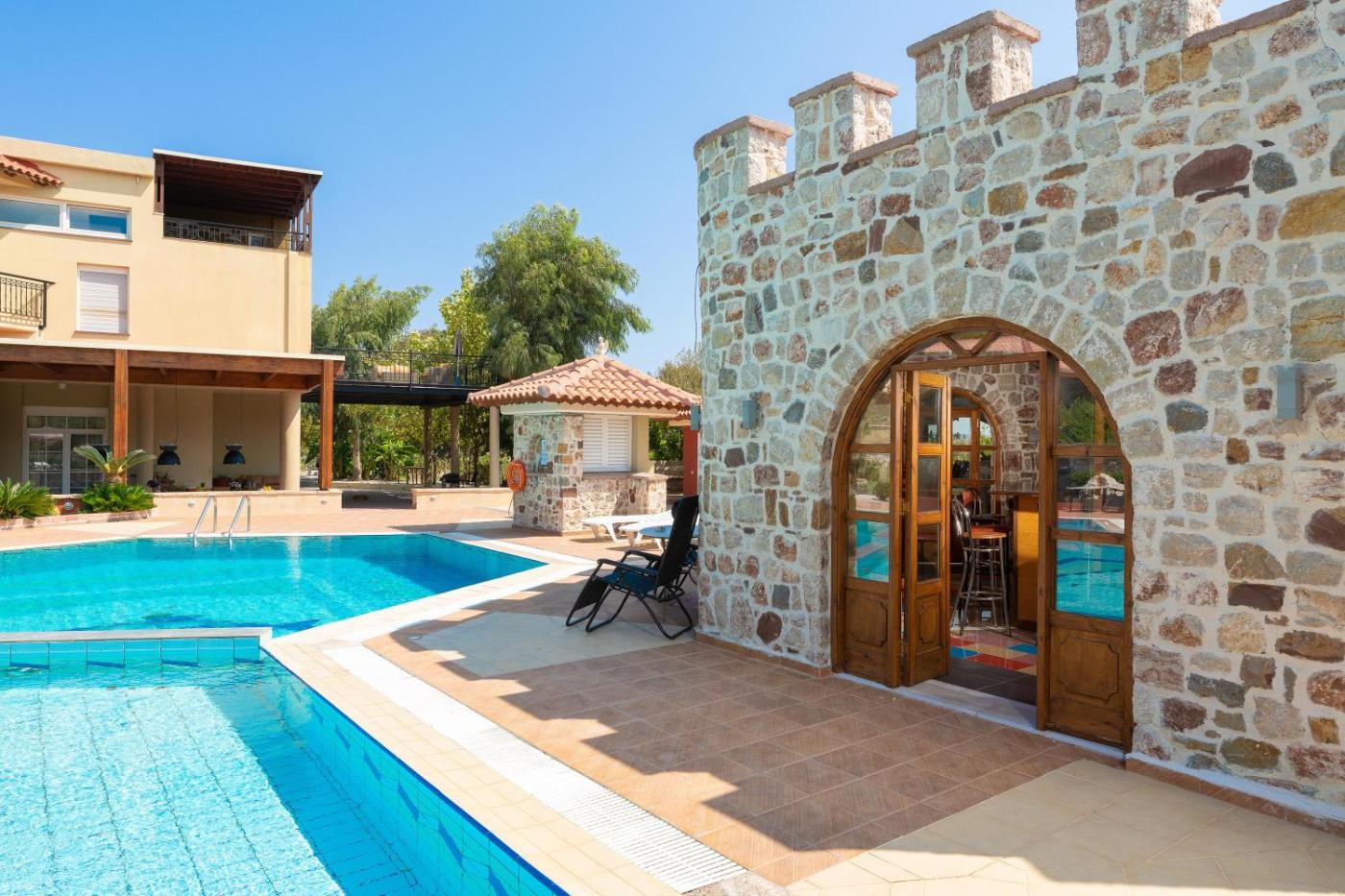 Villa. This villas standout features are the pool with a view and fireplace. Boasting a private entrance, this air-conditioned villa features 3 living rooms, 6 separate bedrooms and 3 bathrooms with a bath and a shower. Guests will find a stovetop, a refrigerator, a dishwasher and kitchenware in the kitchen. The villa also comes with a barbecue. The spacious villa features a washing machine, soundproof walls, a minibar, a flat-screen TV with cable channels, as well as sea views. The unit has 17 beds.